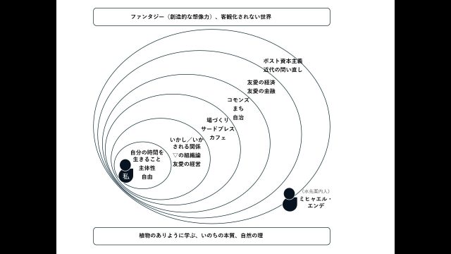 <私>を起点として、そこから広がっていく世界があり、それを多くの場合は空間的な距離によって切り取って、それぞれの体系化を試みている内容がまずある。そして、それらをはさみ込むようにして、ぼくらのすべてを受け止め、促し、共に世界をつくってくれている目に見えない力としての「自然の理」と、「創造的な想像力」への参照が随所にあって、全体を通じての水先案内人がミヒャエル・エンデであるという。